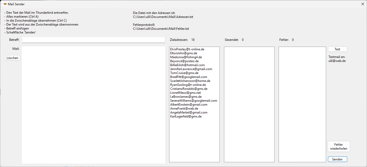 | 1 | Pfad und Name der Datei mit der Liste der E-Mail-Adressen der Empfänger | C:\Users\ulli\Documents\Mail\Adressen.txt |