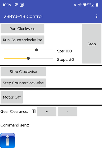 Das Getriebe hat eine Untersetzung von 1:64 (genau sind es 1:63,68395). Für eine komplette Umdrehung (360°) sind also 2038 Schritte (genauer 2.037,8864) notwendig. Leider besitzt das Getriebe ein relativ großes Spiel, das sich bei einem Wechsel der Drehrichtung bemerkbar macht und kompensiert werden muss. Bei meinem Motor sind dazu 11 Schritte notwendig.