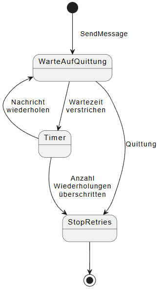 Sendesymbol anzeigen Neue Nachrichtennummer generieren Nachricht für Wiederholungen zwischenspeichern Nachricht versenden Wiederholungszähler zurücksetzen Timer für Wiederholungen starten Weitere Benutzeraktionen verhindern |