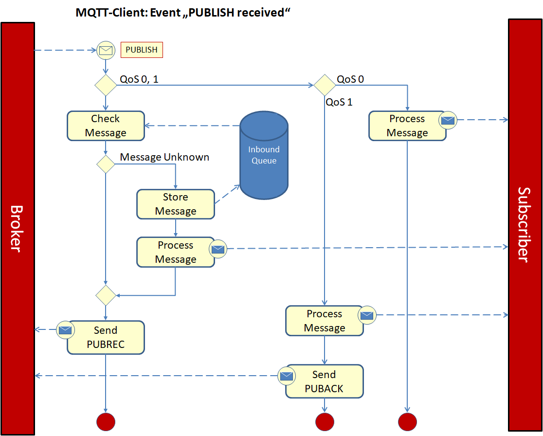 Je nach QoS laufen intern verschiedene Prozesse ab. Dabei ist es gleichgültig, ob ein Client an den Broker sendet oder der Broker an einen Client. Dabei werden nur die Rollen des Senders und des Empfängers getauscht.