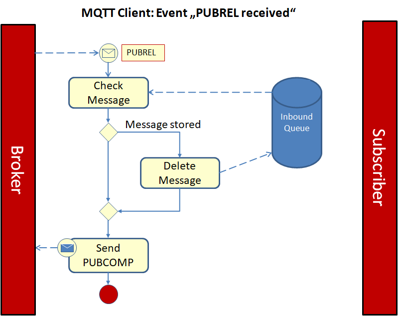Erhält der Empfänger die PUBREL-Nachricht, löscht er die zugehörige PUBLISH-Nachricht aus seiner Inbound-Queue und bestätigt den Vorgang mit einer PUBCOMP-Nachricht.