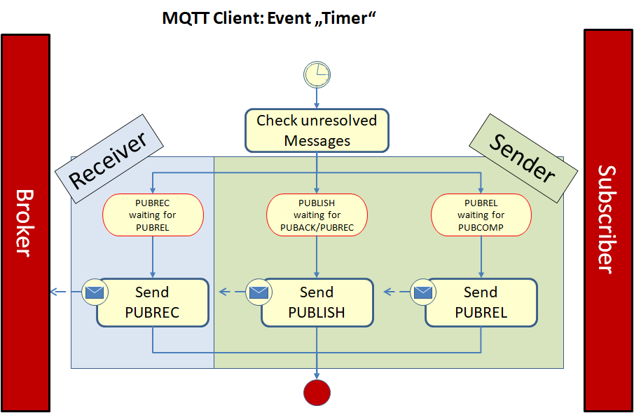 Ein Timer regelt die notwendige Wiederholung des Versendens von Nachrichten. Alle Nachrichten, zu der eine Quittung erwartet wird, werden mit dem Zeitpunkt des Versands gespeichert (in der Outbound-Queue). Erhält der Client die passende Quittung, wird die Nachricht aus der Outbound-Queue gelöscht.
