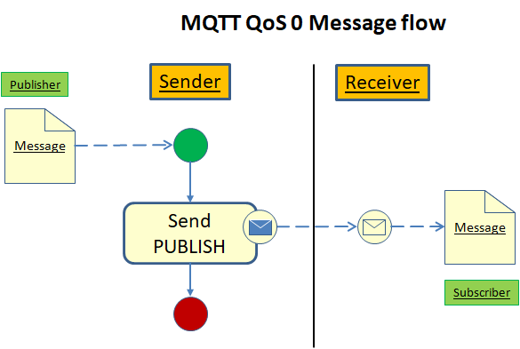 Dies ist der niedrigste QoS-Level. Der Sender versendet eine Nachricht vom Typ PUBLISH und kümmert sich nicht weiter darum. Dies bedingt, dass die Auslieferung der Nachricht nicht garantiert ist.
