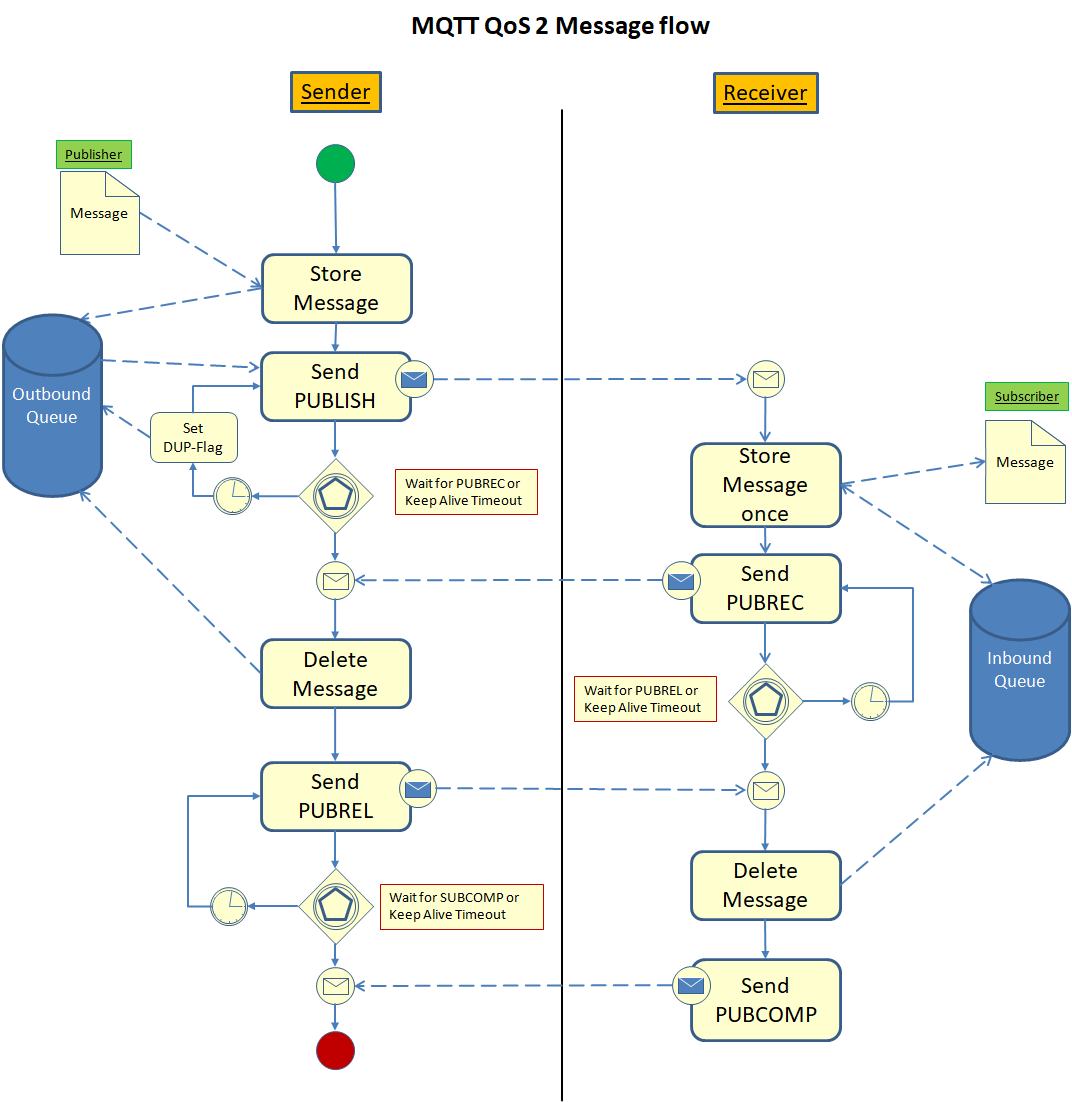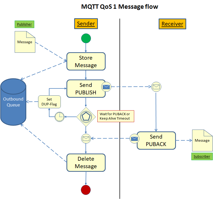Der Übertragungsprozess beginnt damit, dass die Nachricht senderseitig gespeichert wird (Outbound-Queue). Danach wird die Nachricht versandt (Send PUBLISH). Der Sender wartet nun darauf, dass der Empfänger den Erhalt der PUBLISH-Nachricht mit einer Nachricht vom Typ PUBREC (Publish Received) bestätigt. Erhält der Sender in der vorgegeben Zeit (Keep Alive) keine solche Rückmeldung, wird die ursprüngliche Nachricht, nun mit gesetztem DUP-Flag (Duplicate), erneut versandt. Dieser Vorgang wiederholt sich, bis eine entsprechende PUBREC-Nachricht erhalten wurde.