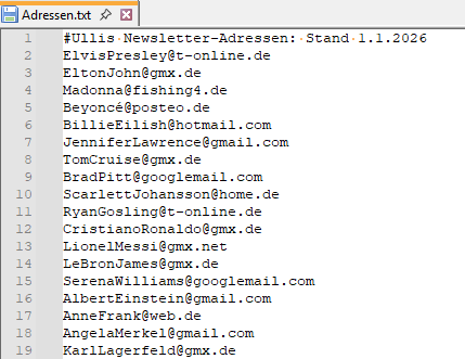 Die Adressenliste ist eine einfache Textdatei mit einer E-Mail-Adresse pro Zeile. Zeilen, die mit # (Rautezeichen) beginnen, werden ignoriert: