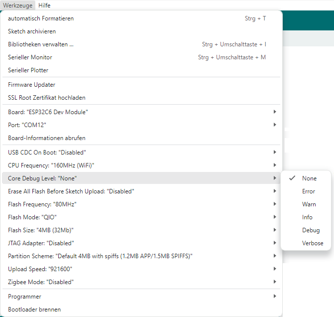 ESP_LOG_ERROR); funktioniert leider im Arduino-Framework nicht. In der Arduino-IDE findet man im Reiter