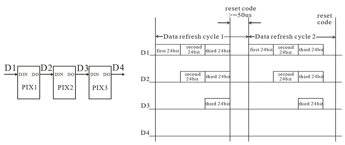 Die WS2812 können kaskadiert werden. Ab dem 25.-Bit werden die Bits an die folgenden WS2812 weiter geleitet:
