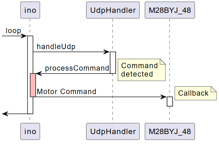 Die Software für den ESP32 besteht aus der Klasse M28BYJ_48, die Steuerung des Motors übernimmt, der Klasse UdpHandler, die eingehende UPD-Kommando-Pakete entgegennimmt und auswertet und dem Hauptprogramm (.ino-Datei), das das System initialisiert und Verbindung zwischen dem UDP-Handler und der Motorsteuerung übernimmt.