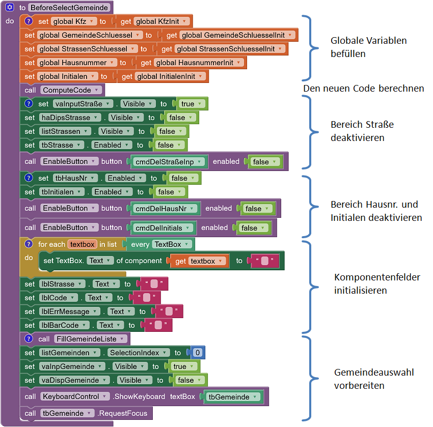 | Procedure | BeforeSelectGemeinde | Bereitet die Selektion der Gemeinde vor. | Call: Event: cmdDelGemeindeDisp.Click Call: Event: cmdDelGemeindeInp.Click Call: Event: Screen1.Initialize |