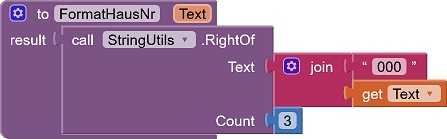 | Function | FormatHausNr | Formatiert die Hausnummer auf drei Stellen mit führenden Nullen. | Call: Event: tbHausNr.TextChanged |