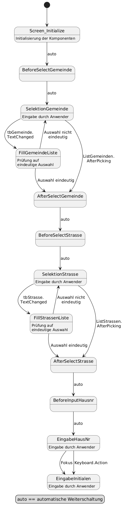 Prozedur BeforeSelectStrasse bereitet die Selektion der Gemeinde vor und deaktiviert alle anderen Bereiche. Insbesondere wird vaInpStrasse sichtbar und haDispStrasse unsichtbar geschaltet. FillStrassenListe selektiert die Gemeinden, deren Namen mit der Zeichenkette beginnt, und prüft, ob die Auswahl bereits eindeutig ist. AfterSelectStrasse wertet die Selektierte Straße aus und befüllt die Felder in vaDispStrasse. haDispStrasse wird sichtbar und vaInpStrasse unsichtbar geschaltet.