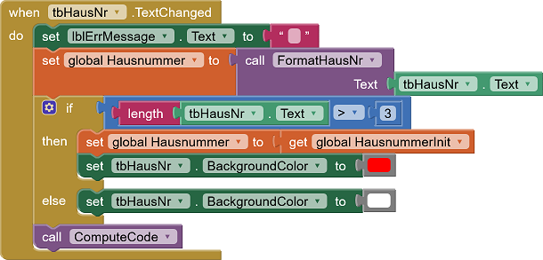 Die Hausnummer muss dreistellig angegeben werden. Die Funktion FormatHausNr fügt führende Nullen ein. Werden mehr als drei Stellen eingegeben, wird der Hintergrund der TextBox auf rot gesetzt. Der globalen Variablen Hausnummer wird der Wert HausnummerInit ("xxx") zugewiesen, als Hinweis, dass keine gültige Hausnummer eingegeben wurde.