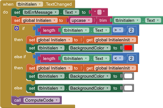 Für die Initialen sind zwei Stellen vorgesehen. Werden mehr als zwei Stellen eingegeben, wird der Hintergrund der TextBox auf rot gesetzt. Ist die Anzahl der eingegebenen Zeichen nicht genau zwei, wird der globalen Variablen Initialen der Wert InitialenInit ("xx") zugewiesen, als Hinweis, dass keine gültigen Initialen eingegeben wurden.