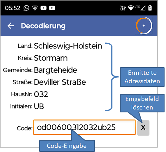 In einer TextBox wird der zu dekodierende EIN-Code eingegeben. Die ermittelten Adresselemente werden während der Eingabe ermittelt und ausgegeben.