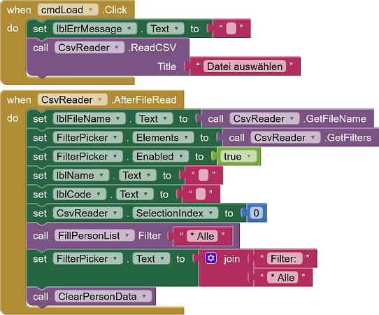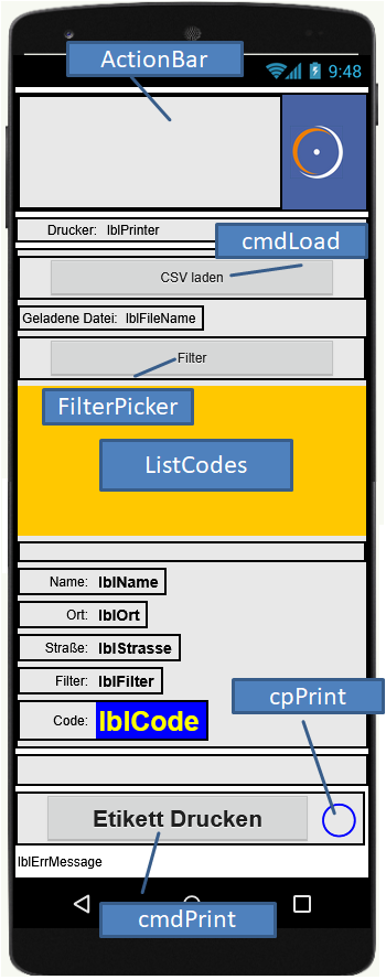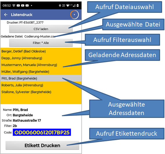 Nach Antippen der Schaltfläche cmdLoad startet eine Dialogfolge zur Auswahl einer CSV-Datei. Die ausgewählte Datei wird von der Extension UrsCsvReader eingelesen und aufbereitet. Die eingelesen Daten werden gefiltert in die Listview-Komponente übertragen. Wird eine Zeile ausgewählt, werden die dazugehörenden Daten in den Label-Komponenten darunter angezeigt und die Schaltfläche zum Drucken des Etiketts freigegeben.