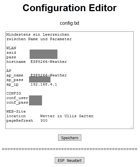 Der Text kann im Browser-Fenster bearbeitet und über die Schaltfläche "Speichern" gespeichert werden. Folgende Zugriffe auf die Einstellungen greifen auf die neuen Daten zu. Einige Änderungen werden allerdings erst nach einem Neustart des Systems wirksam. Dieser Neustart kann über die Schaltfläche "ESP Neustart" ausgelöst werden.
