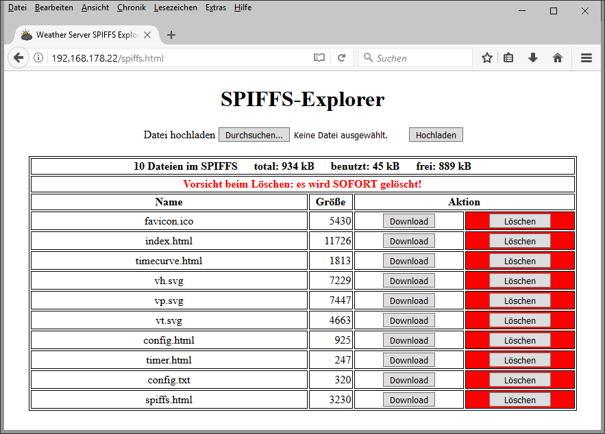 Die unsichtbare Musterzeile wird von einem Java-Script für jede Datei im SPIFFS dupliziert, angepasst und sichtbar gemacht.